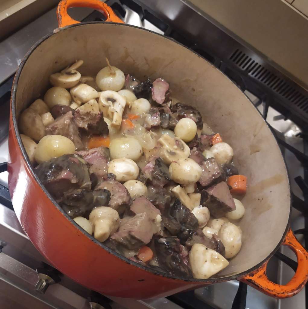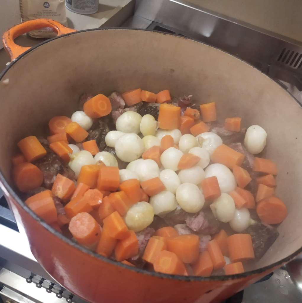 תקציר המתכון - נסווד בשר לבישול ארוך עד שיתרכך (65*33 כאן), נסווד גזר ובצלצלים לריכוך (85*1). נכין רביכה מחמאה מומסת לתוכה נערבב קמח ותבלינים, כשנקבל עיסה אחידה נוסיף ציר בקר ונערבב עד שנקבל רוטב סמיך וטעים. נעטוף את הבשר, הגזר הבצל הפרויות טריות ברוטב ונגיש עם אורז או פוקאצ'ה.