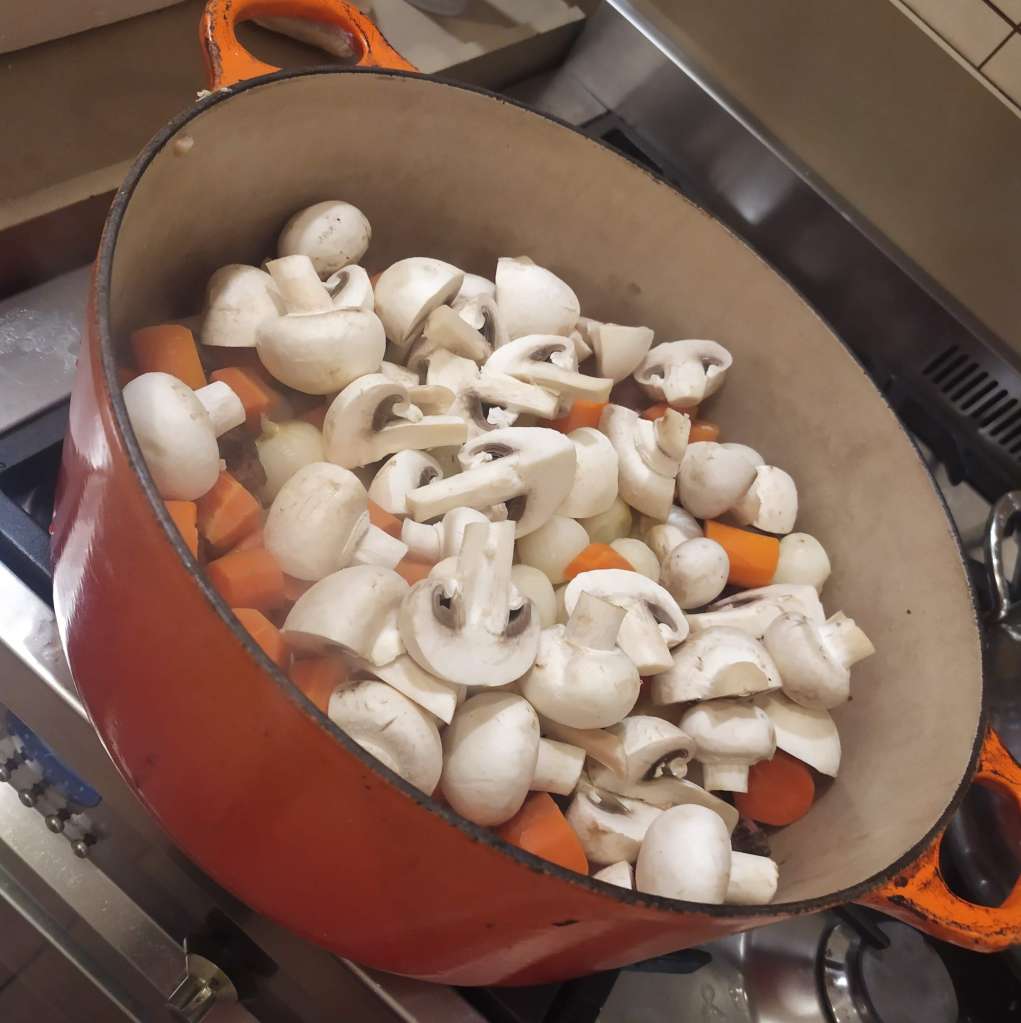 6.הרכבה – נייבש את הבשר ונחתוך לקוביות של 3*3 (מומלץ לצרוב במחבת), נוסיף בצלים, גזרים ופטריות, נכסה ברוטב הסמיך ונגיש.