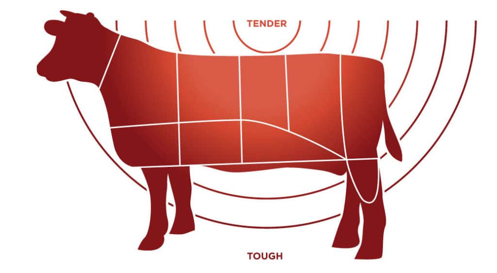 אבל בהתחשב מספיק זמן, חום, לחות, הקולגן יהפוך לג'לטין. וג'לטין ושומן מומס כאשר הם מבושלים low&slow מעניקים לנתחים עסיסיות נפלאה - למטה יש דוגמה של הפריסה של נתחים קשים ורכים, נתחים לדוגמה- חזה בקר, קשתית, לשון, שוק וכו'