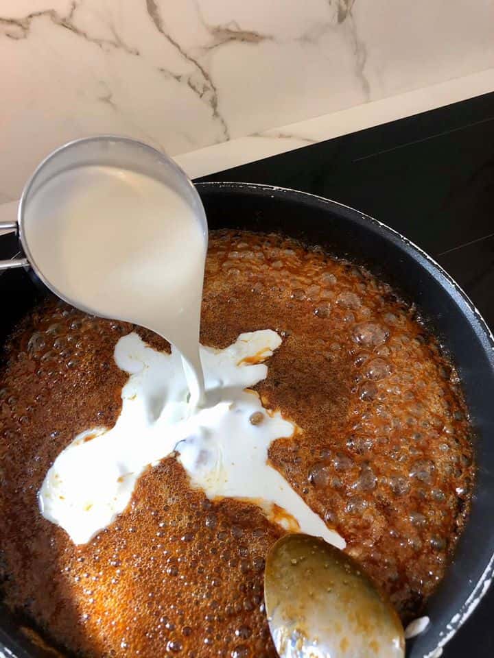 מחממים את הסוכר ושמן הקוקוס בסיר עד שמקבלים קרמל שחום ונוזלי. מורידים מהאש ומוסיפים בזהירות את השמנת. בזמן שמוסיפים את השמנת התערובת תבעבע חזק לכמה שניות בזמן שהמים מהשמנת מתאדים.