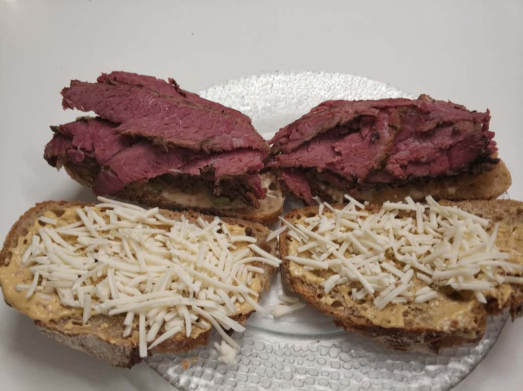 על לחם מחמצת שיפון נמרח חרדל-חזרת ורוטב אלף איים מאולתר ממיונז, טיפה קטשופ ונוזלי הבשר. עליו פלפל חלפיניו והכרוב הכבוש. עליו הבשר שנפרס דק דק ועליו גבינת מוצרלה טבעונית (גם שומר שבת וגם כשרות 😉).