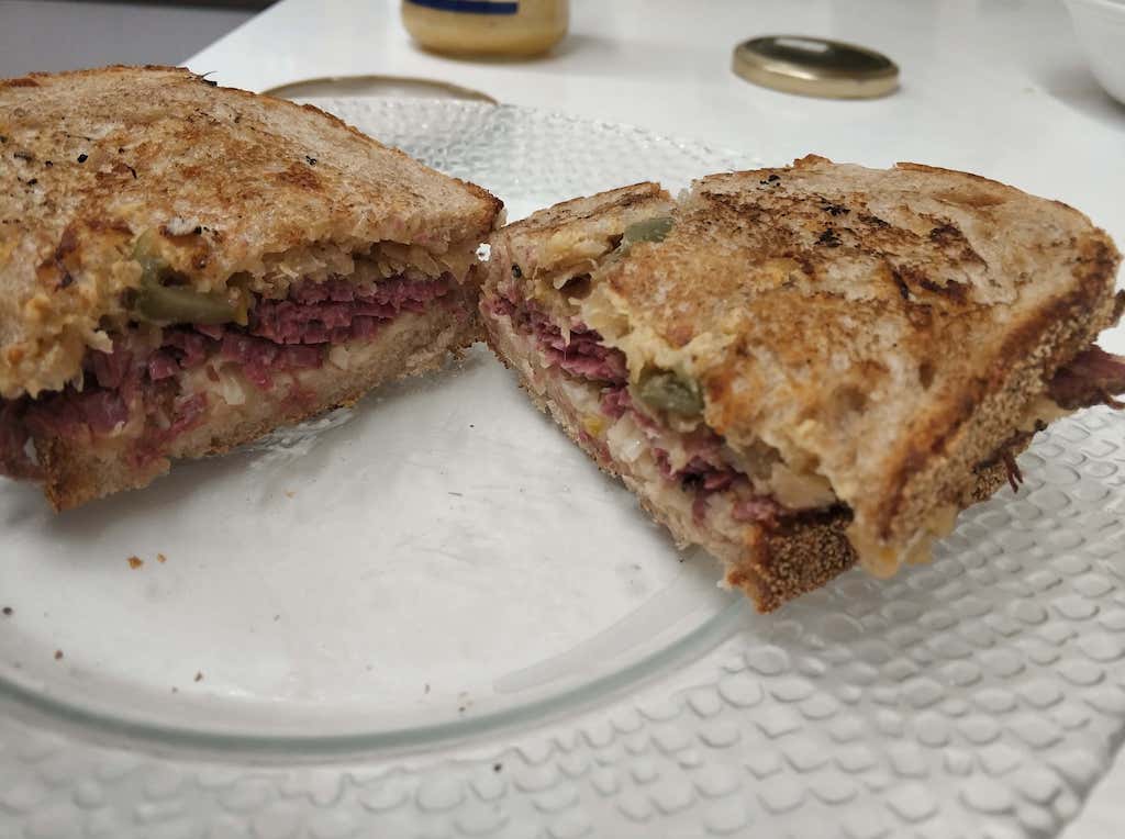 החלטתי לאכול אותו בתור סנדוויץ רובן. כרוב כבוש מקופסה נשטף וסונן על מנת להוציא חלק מהחמיצות וטעמי הלוואי של השימורים והוקפץ במחבת יחד עם מייפל אמיתי ונוזלי הבשר ששמרתי.